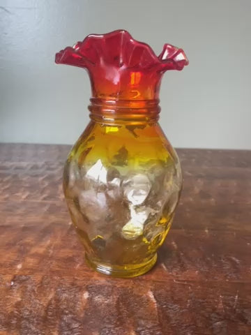 Fiery red melting to a bright lemony yellow base. This hand-blown vase literally glows! The vase measures 7-1/2" tall and will easily hold a large bouquet of your favorite flowers. There are no chips or cracks.