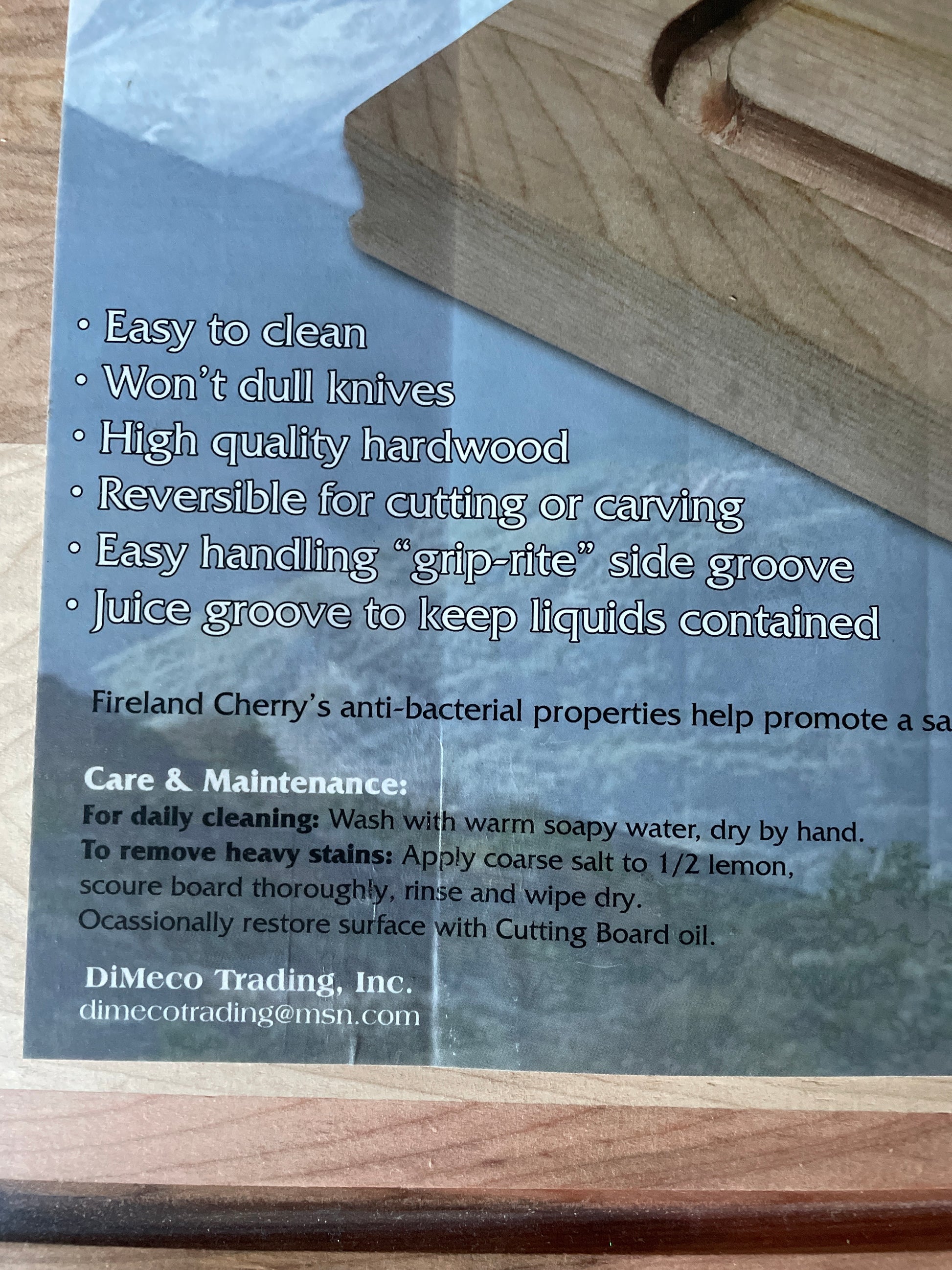 This is still in original packaging and never used. This cutting board is made of cherry wood and has a juice groove. The board measures 12.5” x 12.5” x .75”