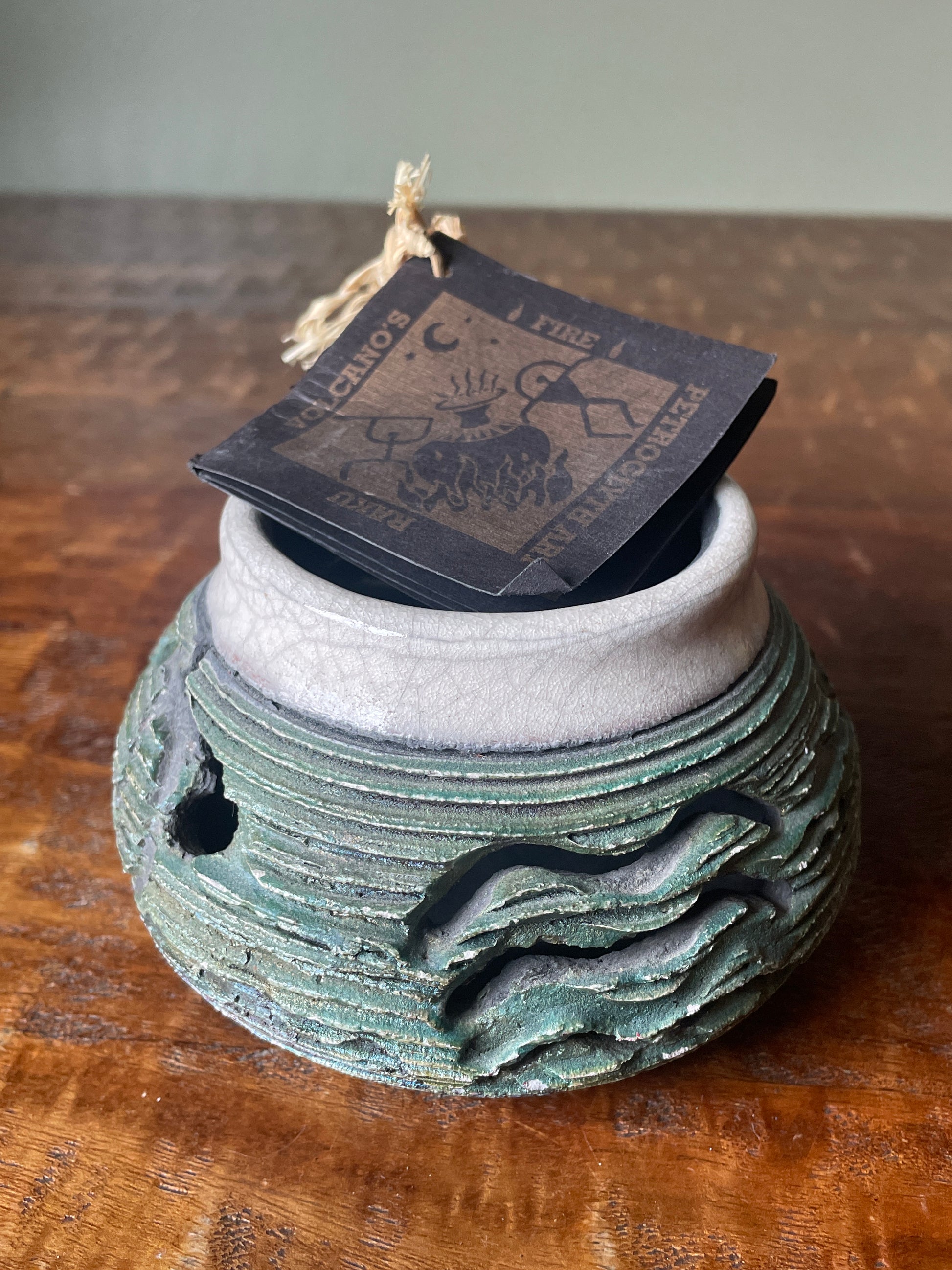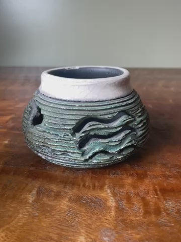 This unique Ben Diller Raku candle votive features a beautiful animal print pattern in beige and black colors over a medium-sized round shape made of volcanic pottery material. The design showcases a detailed carving of a sea turtle, giving a touch of ethnic style to your home decor. Its finish is a beautiful Raku technique, which adds uniqueness to the product. Perfect for collectors of decorative items and sea turtle enthusiasts, this Ben Diller candle votive will bring a touch of the ocean into your home.