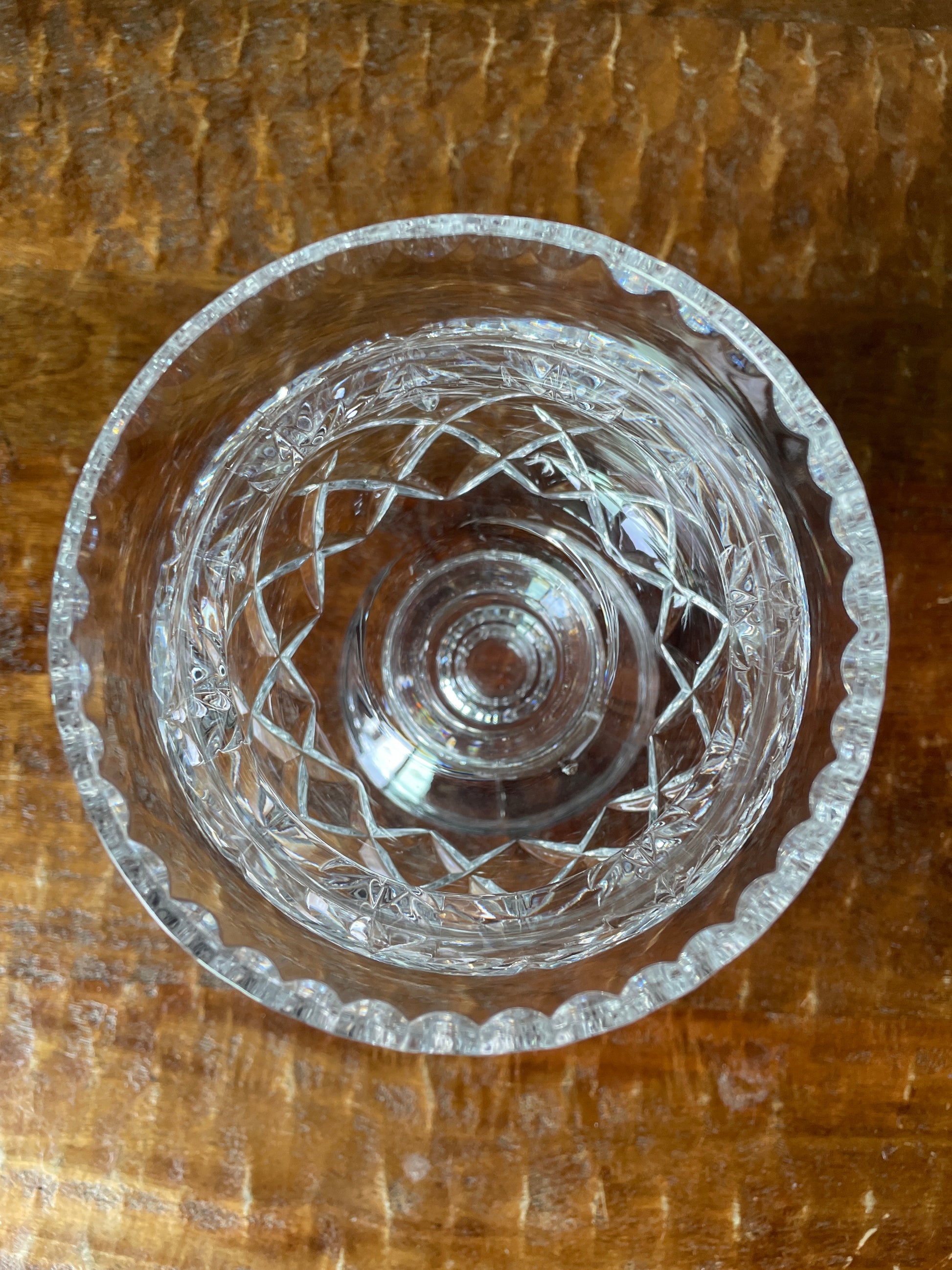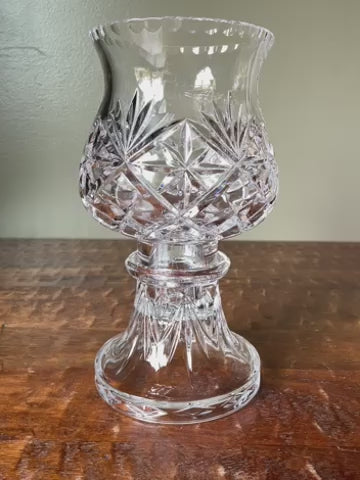 Add a touch of vintage charm to your home decor with this beautiful 2-piece hurricane lamp style candle holder featuring a classic tapered globe shape and a stunning diamond and pineapple top pattern made of cut crystal. Perfect for any occasion and suitable for candles, tables, desks, etc., this medium-sized candle holder is a must-have for collectors. An Absolutely gorgeous piece.