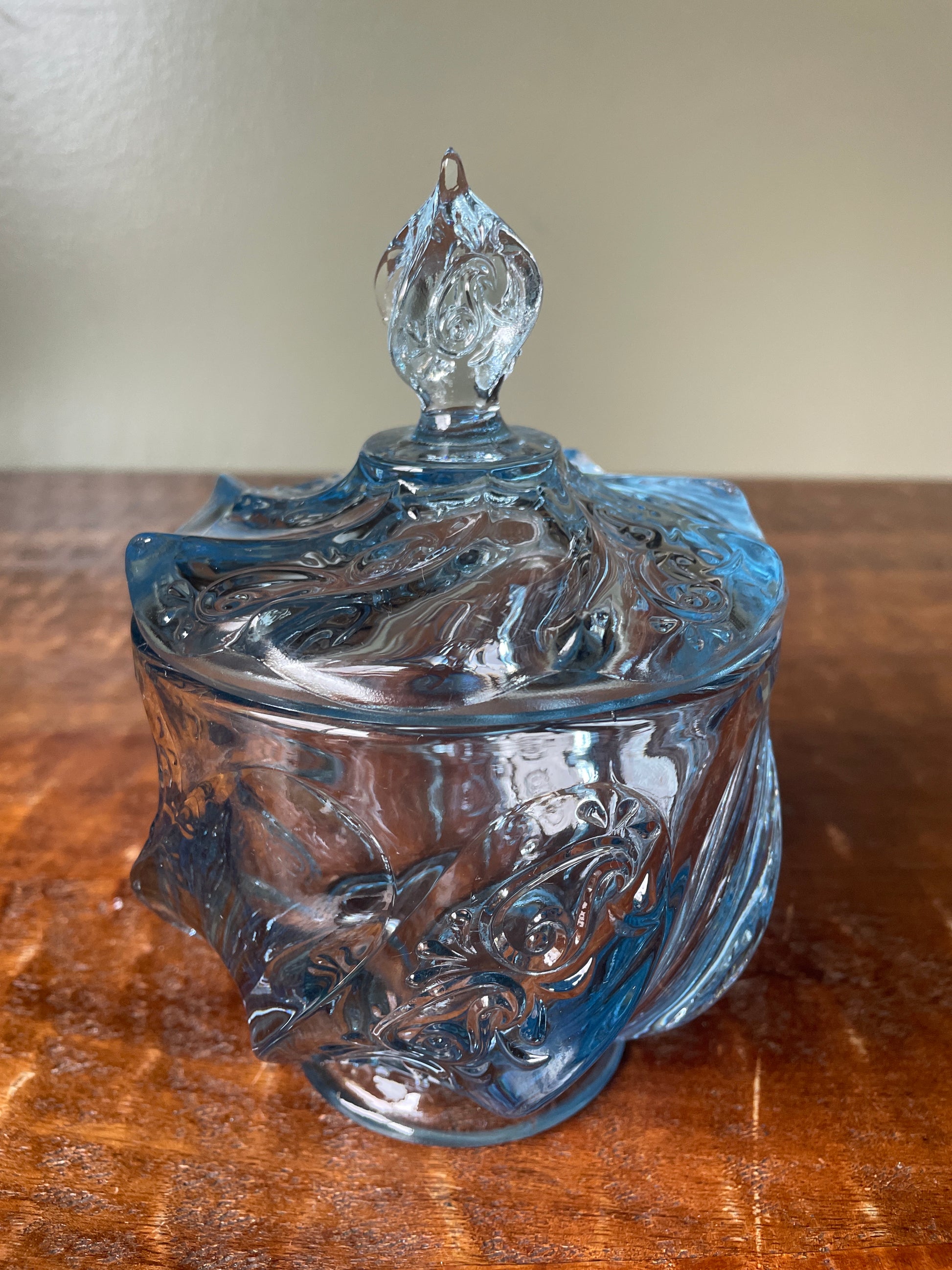 Beautiful Fenton Covered Candy Dish Paisley pattern Salem Blue. It is in excellent condition with no chips or repairs.