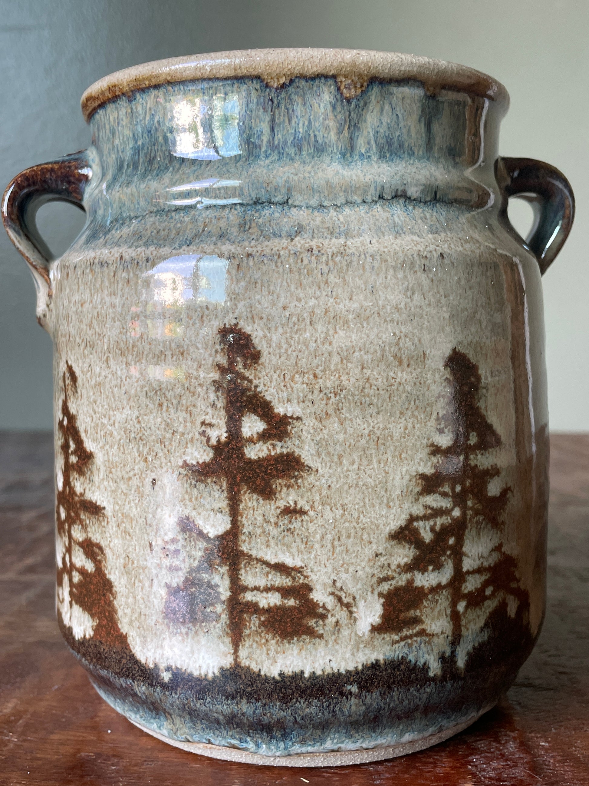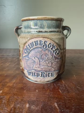 This is a nice piece of studio Art Pottery that is signed by artist. It has great warm classic colors and has label of “Minnesota Wild Rice” on the front. This crock stands 6.25” tall and has a 4.5” base with an opening of 3.75”